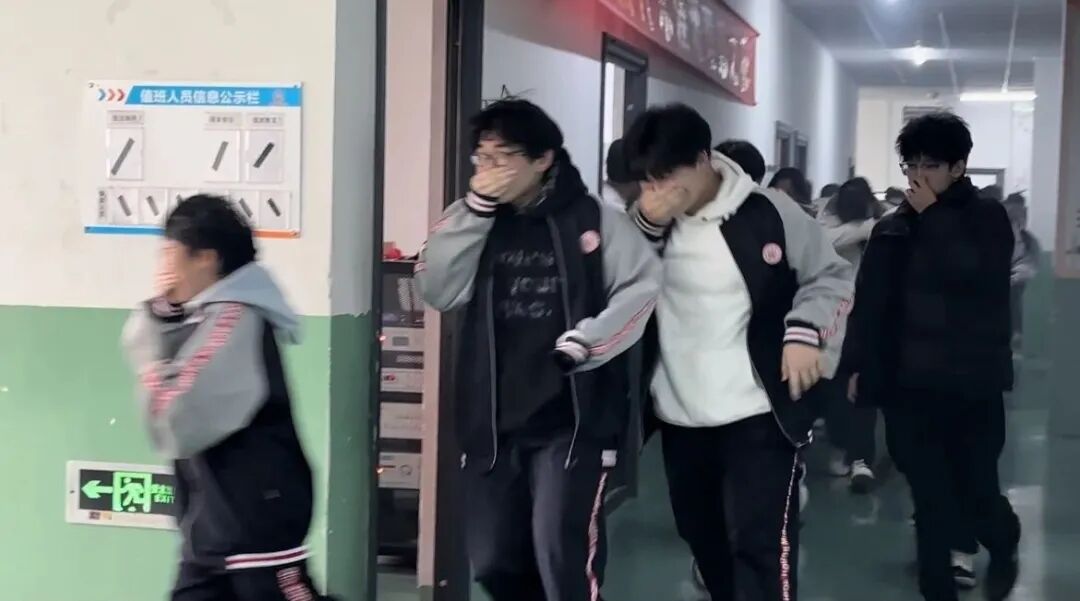 听到警报后,同学们迅速捂住口鼻,低头弯腰,沿墙有序撤离。各楼层、拐角均有教师值守引导,防止发生拥挤、摔倒,确保疏散过程安全、高效。