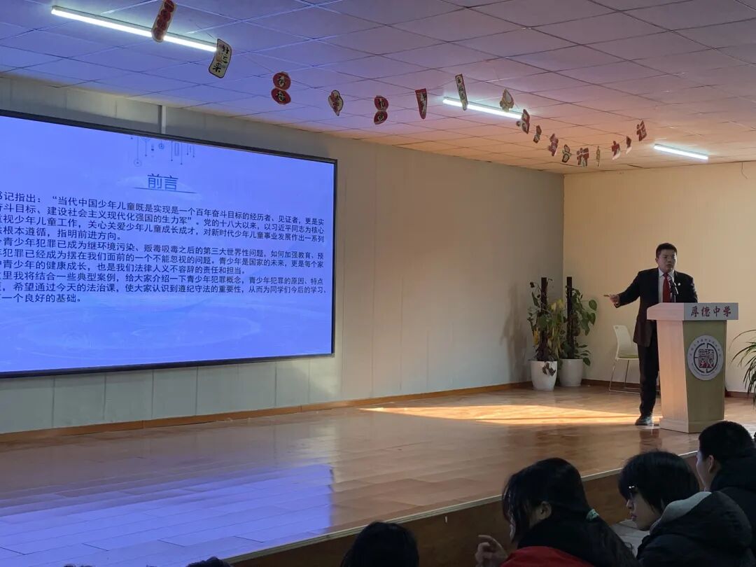 2026年1月21日我校特别聘请——裕华区人民法院刑事审判庭法官助理高晨豫法治副校长,为全体师生带来 “预防未成年人犯罪” 专题法治讲座。深入探讨青少年犯罪的概念、原因、特点及预防措施,助力青少年健康成长。